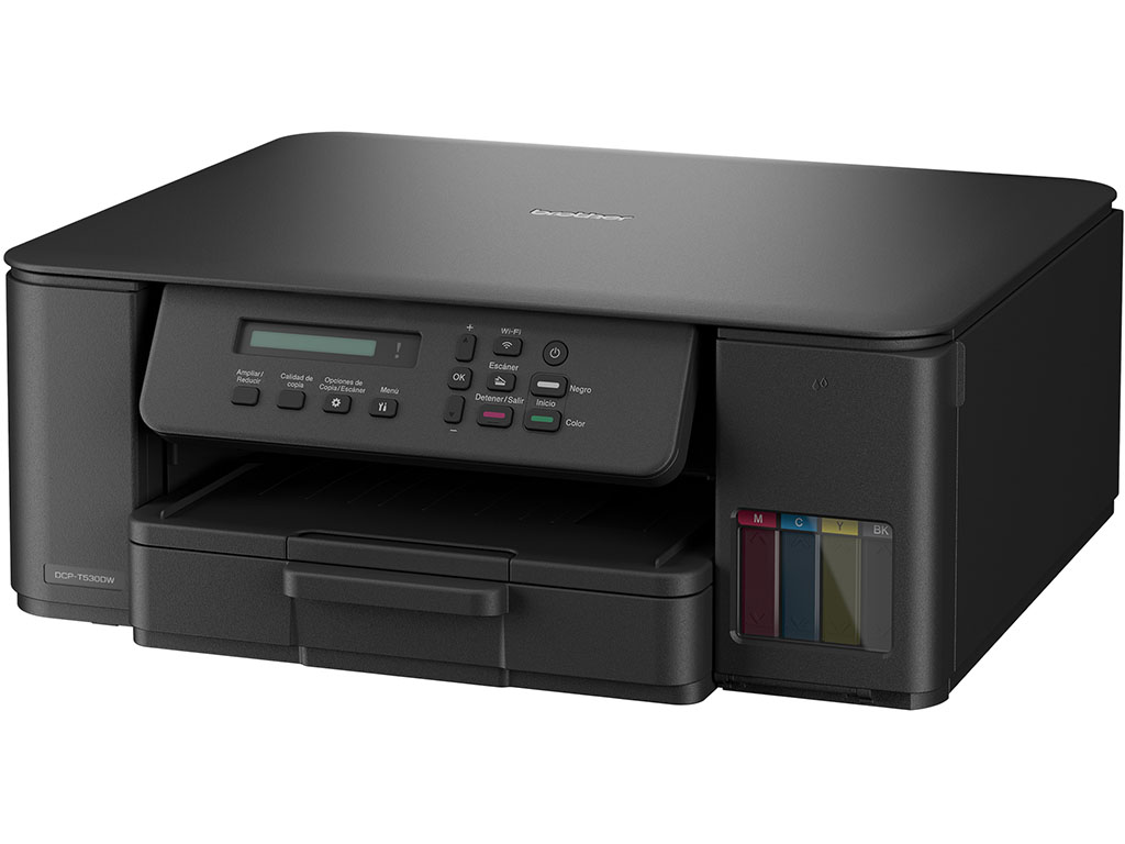 | Contenido de la caja | • DCP-T530DW de Brother • Una botella de tinta negra BTD100BK de ultra alto rendimiento • Botellas de tinta cian, magenta y amarilla BTD100C/M/Y • Guía de configuración rápida • Guía de seguridad del producto • Cable USB |