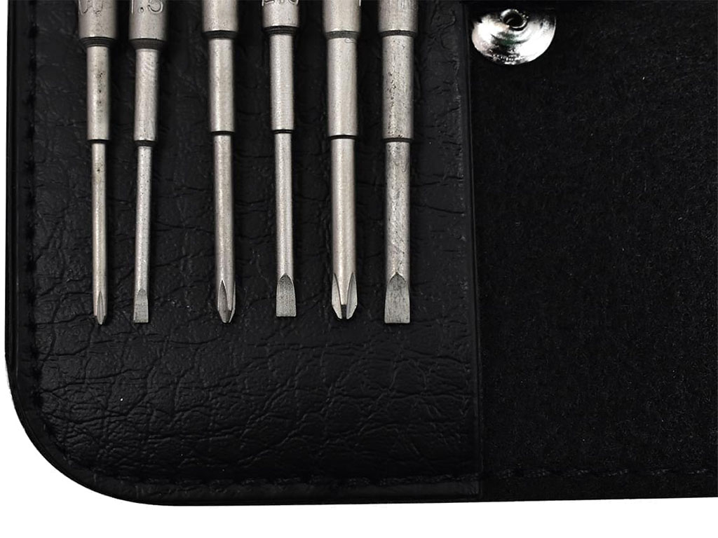 El set incluye puntas planas, Phillips y Torx, cubriendo medidas habituales en tareas de precisión. Además, su estuche compacto facilita el guardado y transporte, mientras que sus dimensiones y formato general lo vuelven una alternativa útil para quienes buscan un kit simple, ordenado y fácil de usar en reparaciones menores o ajustes cotidianos.