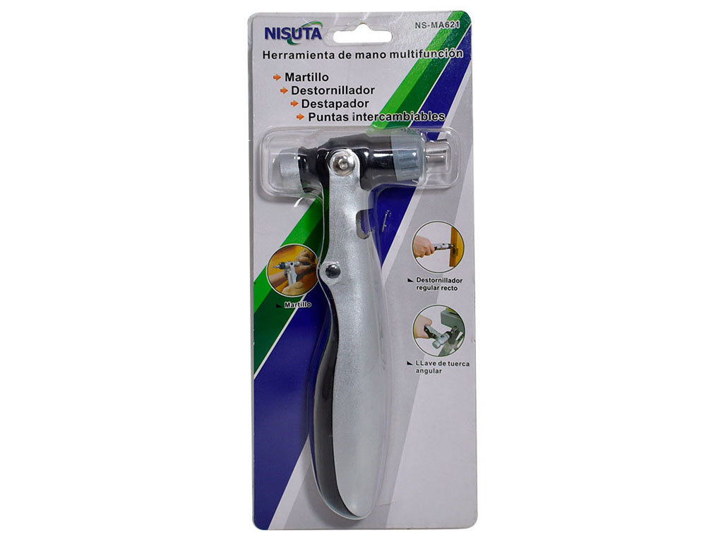 El kit multiuso Nisuta NSMA621 es una herramienta práctica y versátil pensada para tareas de ajuste, armado y reparaciones generales. Su diseño integra funciones de martillo, destornillador y llave tubo en un solo cuerpo compacto, lo que lo convierte en una opción útil para tener a mano en el hogar, el taller o la caja de herramientas.