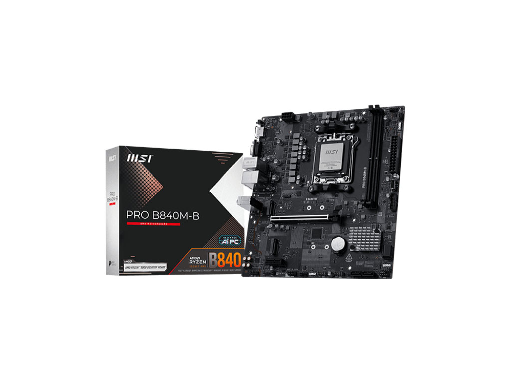 Motherboard MSI PRO B840M-B junto a su caja, con soporte para red 2.5G, tecnología Lightning Gen 4 y certificación Ready for AI PC.