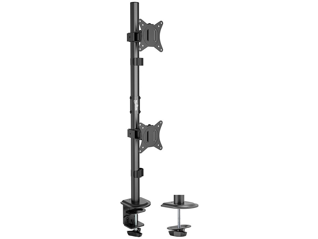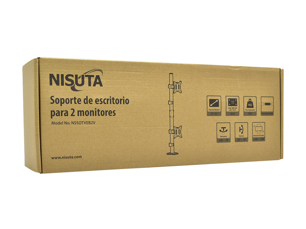 El soporte de escritorio Nisuta NSSOTVEB2V está diseñado para armar una configuración doble en vertical (una pantalla arriba de la otra) con monitores o TVs de 17 a 32", ideal cuando querés maximizar espacio y mantener el escritorio despejado. Su estructura brinda una sujeción firme y soporta hasta 9 kg por monitor, convirtiéndose en una opción práctica para puestos de trabajo con poco ancho disponible, escritorios compactos o setups donde la altura es tu mejor aliada para ganar comodidad y orden.
