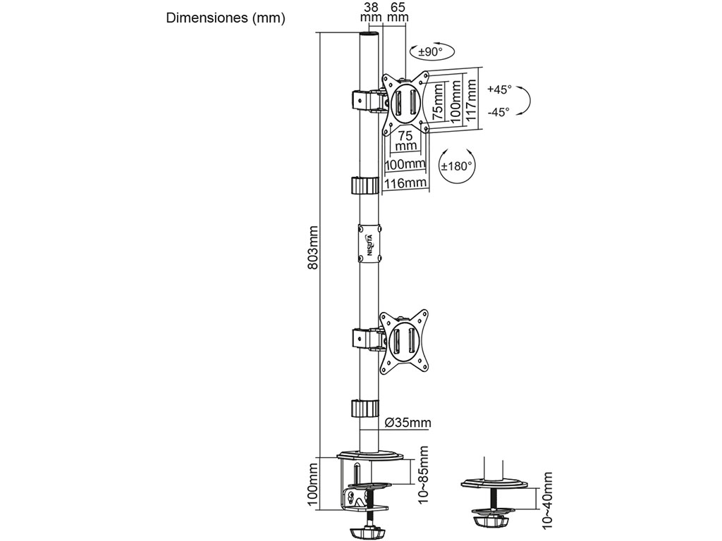 Es compatible con VESA 75x75 y 100x100 y permite ajustar cada pantalla para lograr una alineación precisa: inclinación de +45° a -45°, desplazamiento horizontal de +90° a -90° y rotación de +180° a -180°. Además, incluye organizador de cables, para que el cableado quede prolijo y el conjunto mantenga un look más limpio y profesional, tanto en oficina como en home office.