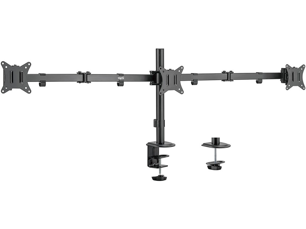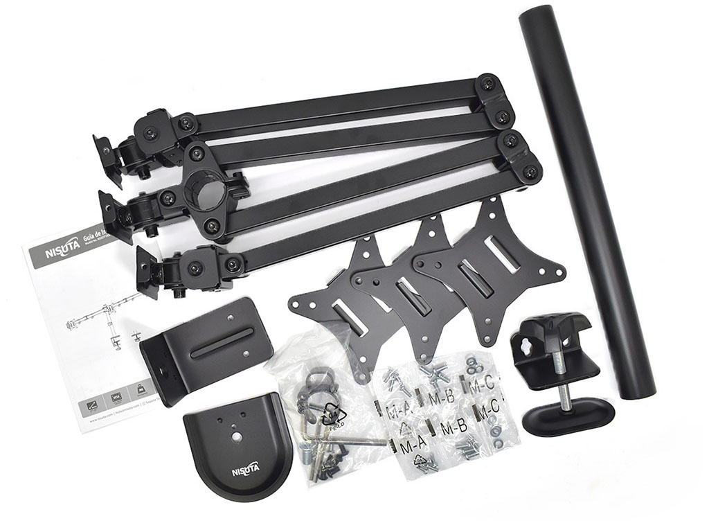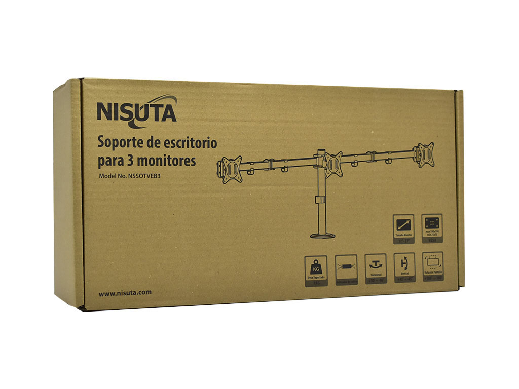 El soporte de escritorio Nisuta NSSOTVEB3 está pensado para armar una estación triple monitor limpia, estable y cómoda, ideal para productividad, monitoreo, edición o cualquier flujo de trabajo donde necesitás tener varias ventanas siempre a la vista. Permite montar 3 monitores o TVs de 17 a 27" sobre escritorio, optimizando el espacio y mejorando la ergonomía al ubicar cada pantalla a una altura y orientación más natural. Soporta hasta 7 kg por monitor, ofreciendo una base firme para configuraciones múltiples sin ocupar superficie extra.