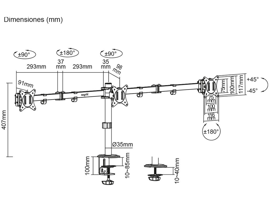 Es compatible con VESA 75x75 y 100x100 y brinda ajustes completos para alinear cada pantalla con precisión: inclinación de +45° a -45°, desplazamiento horizontal de +90° a -90° y rotación de +180° a -180°. Además, incluye organizador de cables, para mantener el puesto prolijo, reducir el desorden visual y lograr una presentación más profesional, tanto en oficina como en home office.